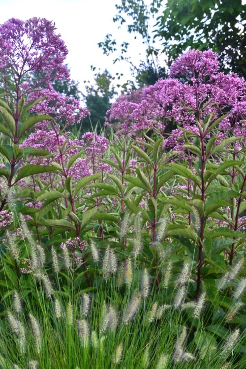 Growing 4 to 5 feet tall, the Gateway Joe Pye Weed is ideal for use as a specimen or in groupings in perennial borders or behind low growing shrubs in landscape borders. A fine addition to butterfly gardens, pink theme gardens and consistently moist bog and meadow gardens.